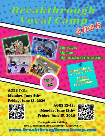Experience a week of singing, performance, and fun at the Turnagain Arts Building! Whether you’re new to the stage or looking to refine your skills, this camp is designed to help you grow as a performer.